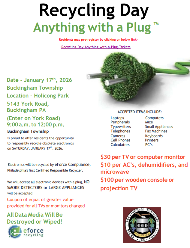 Buckingham Township is hosting an Anything With a Plug Recycling Day for residents looking to responsibly recycle electronic items. Pre-registration is required to participate, and online registration only is available at the link below: