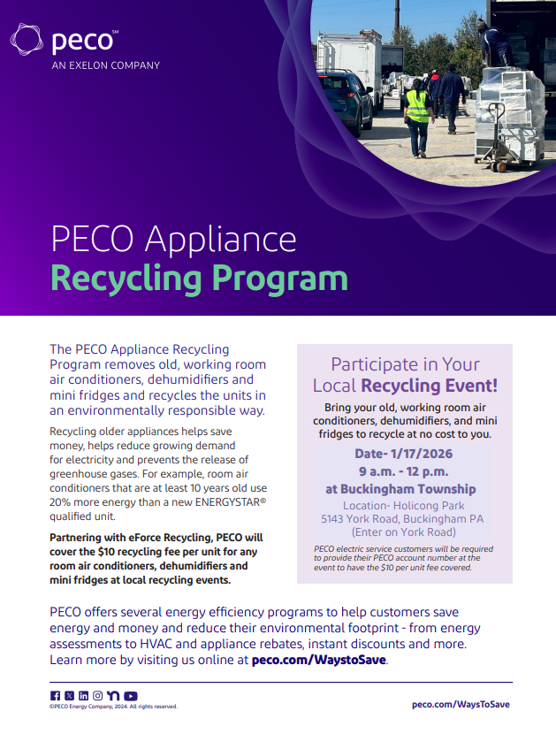 PECO customers partnering with eForce Recycling will receive $10 per unit for air conditioners, dehumidifiers, and mini fridges. A valid PECO account number must be provided at the event to qualify.
